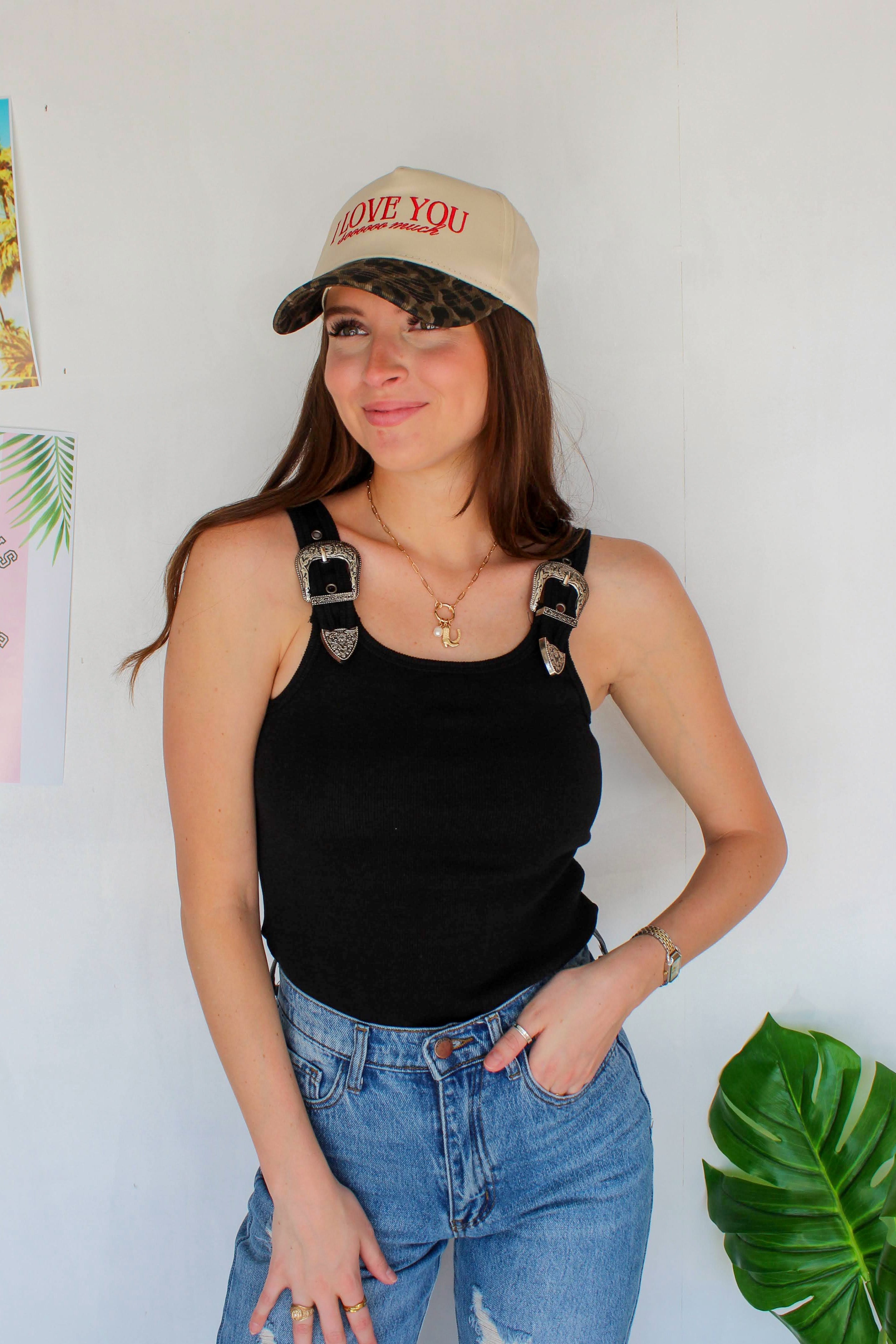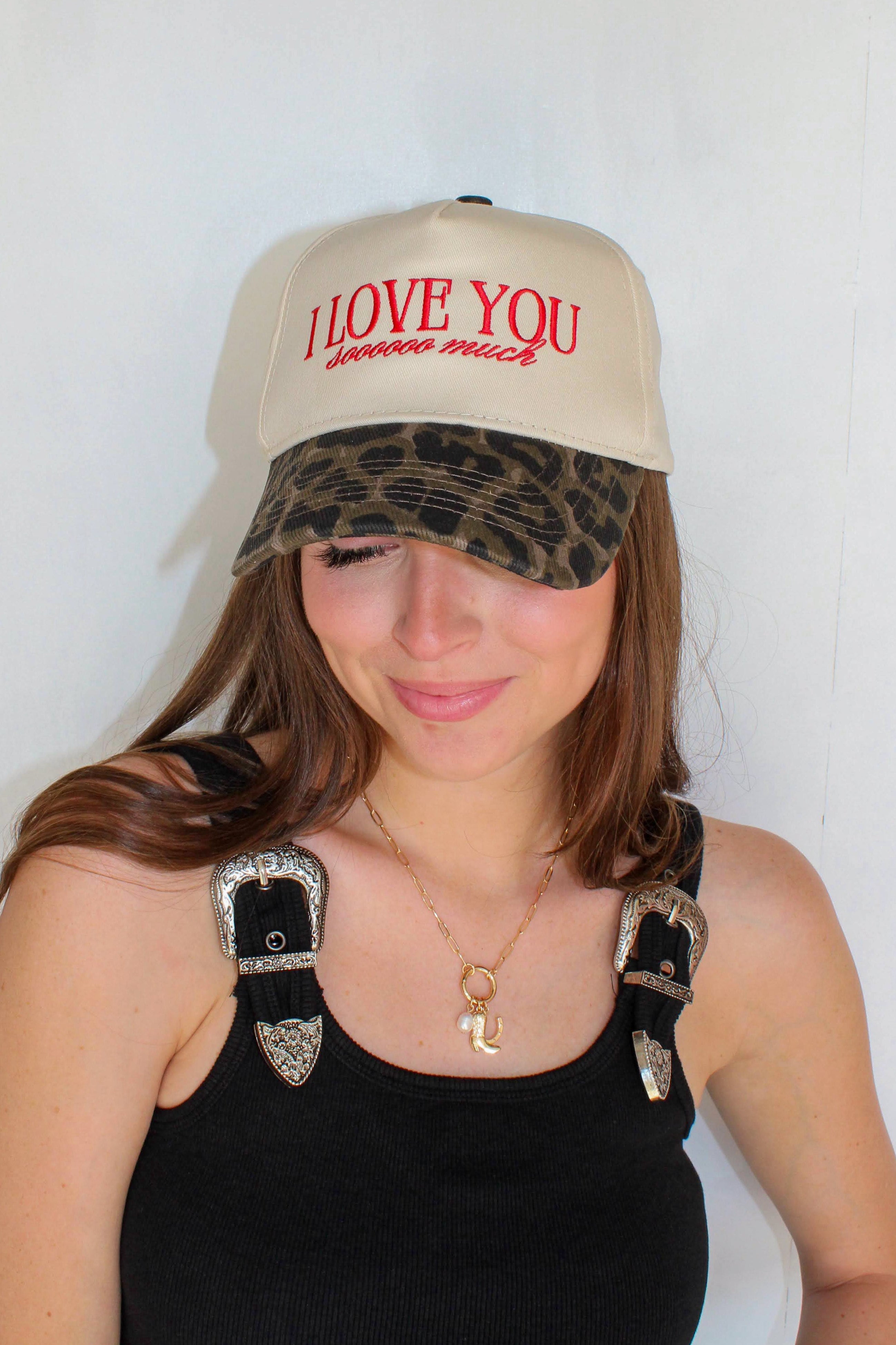 - ivory canvas trucker hat with cheetah print brim