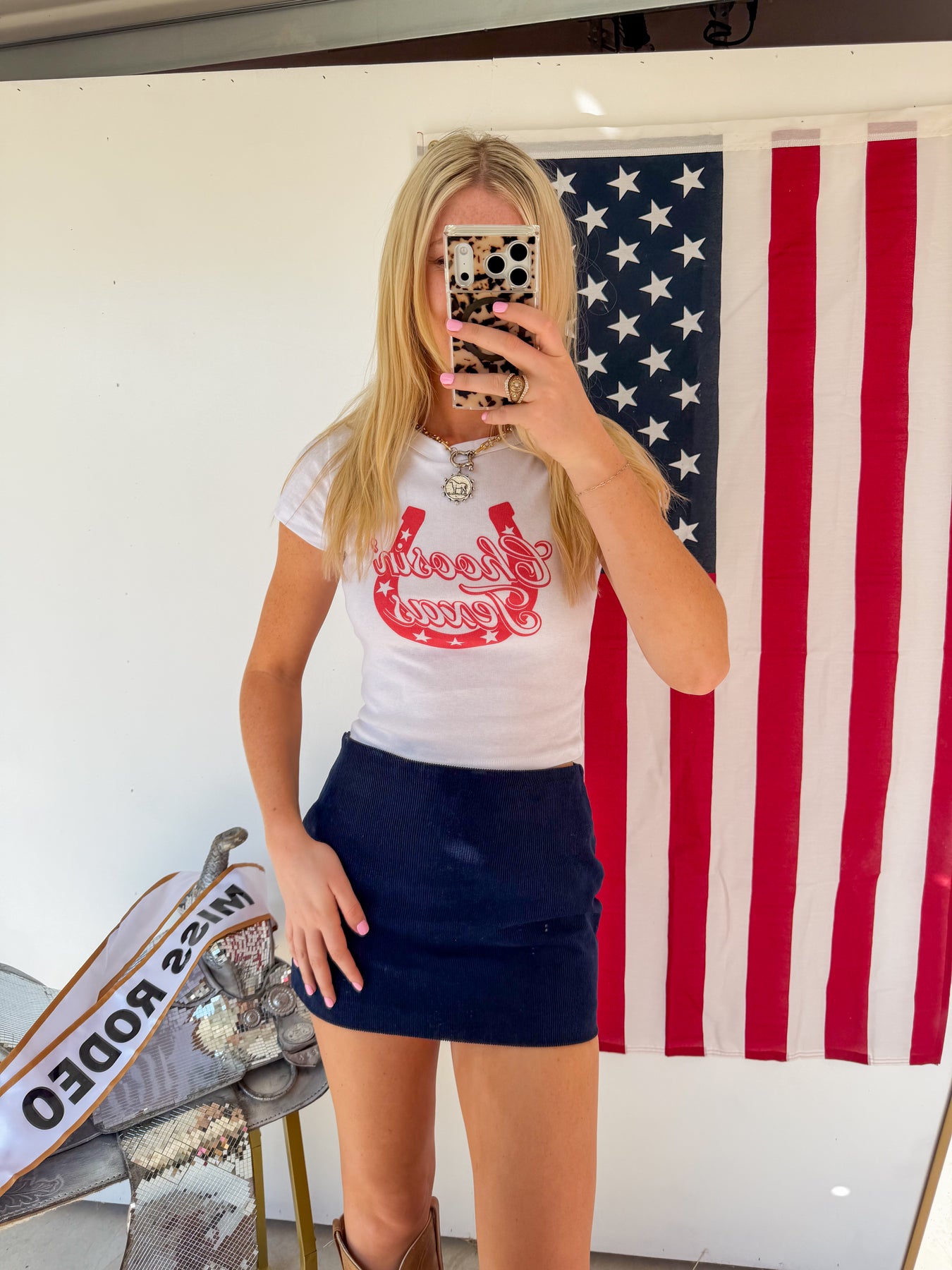 - white baby tee with red graphic of "Choosin' Texas"