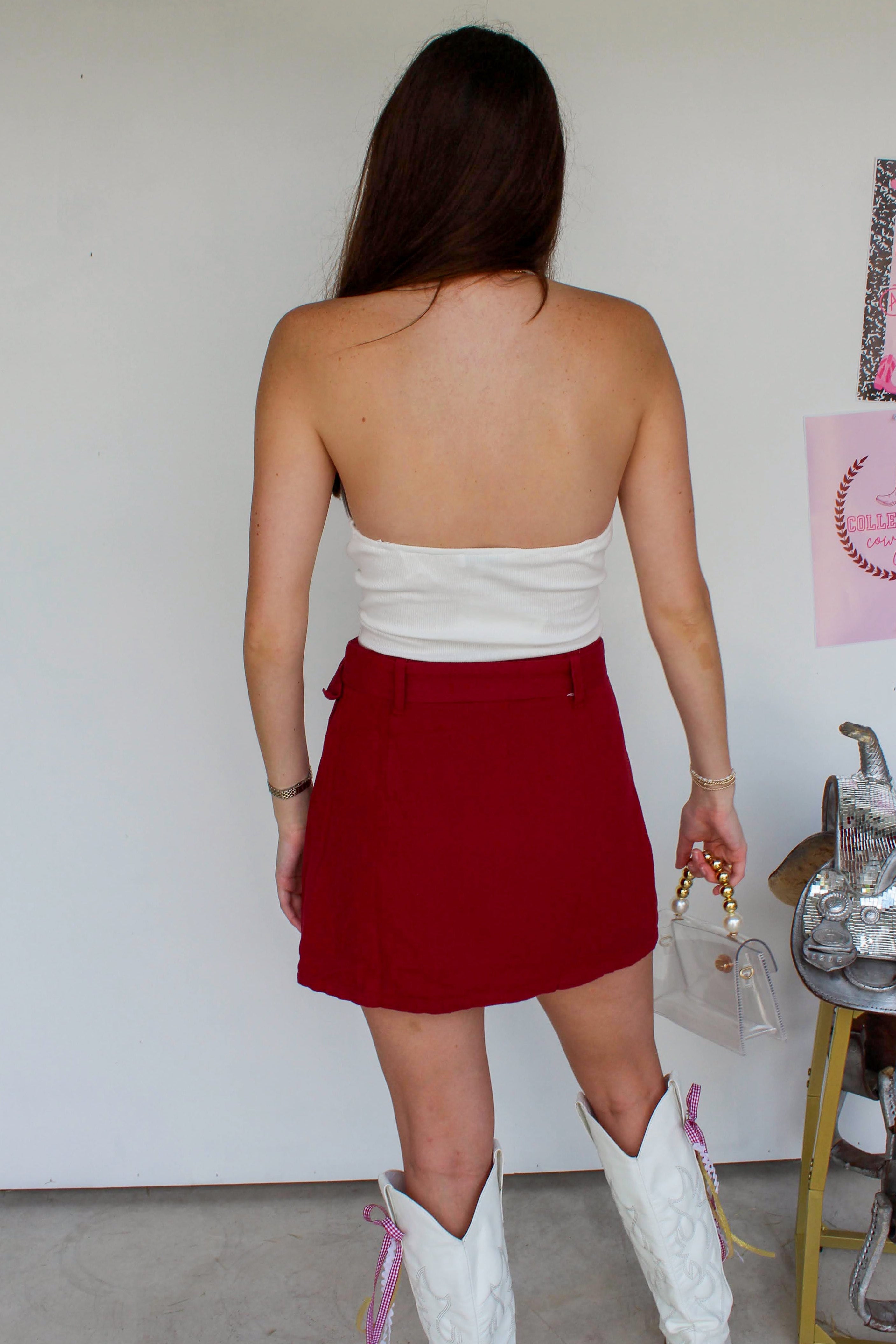 Maroon Belted Denim Skirt