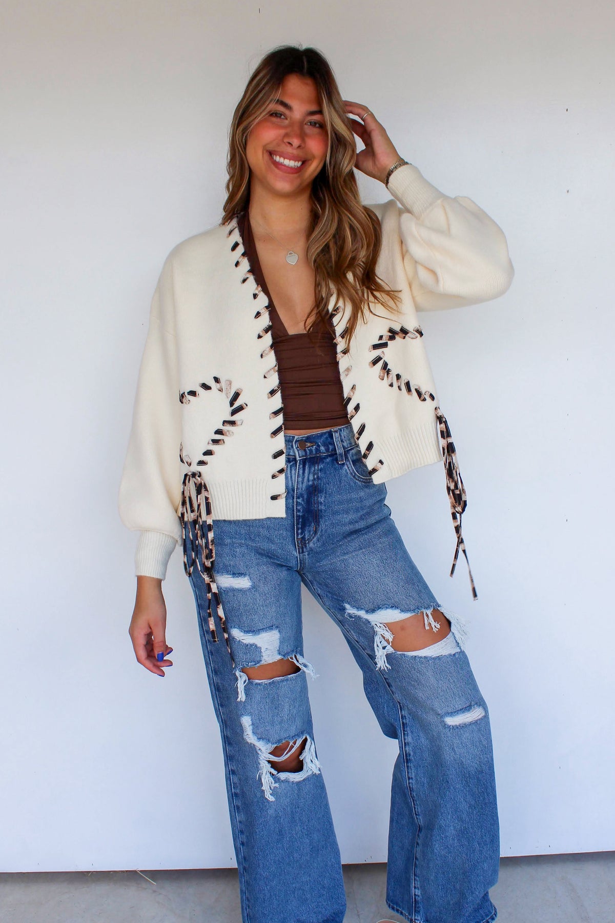 - ivory colored knit cardigan with cheetah print trim