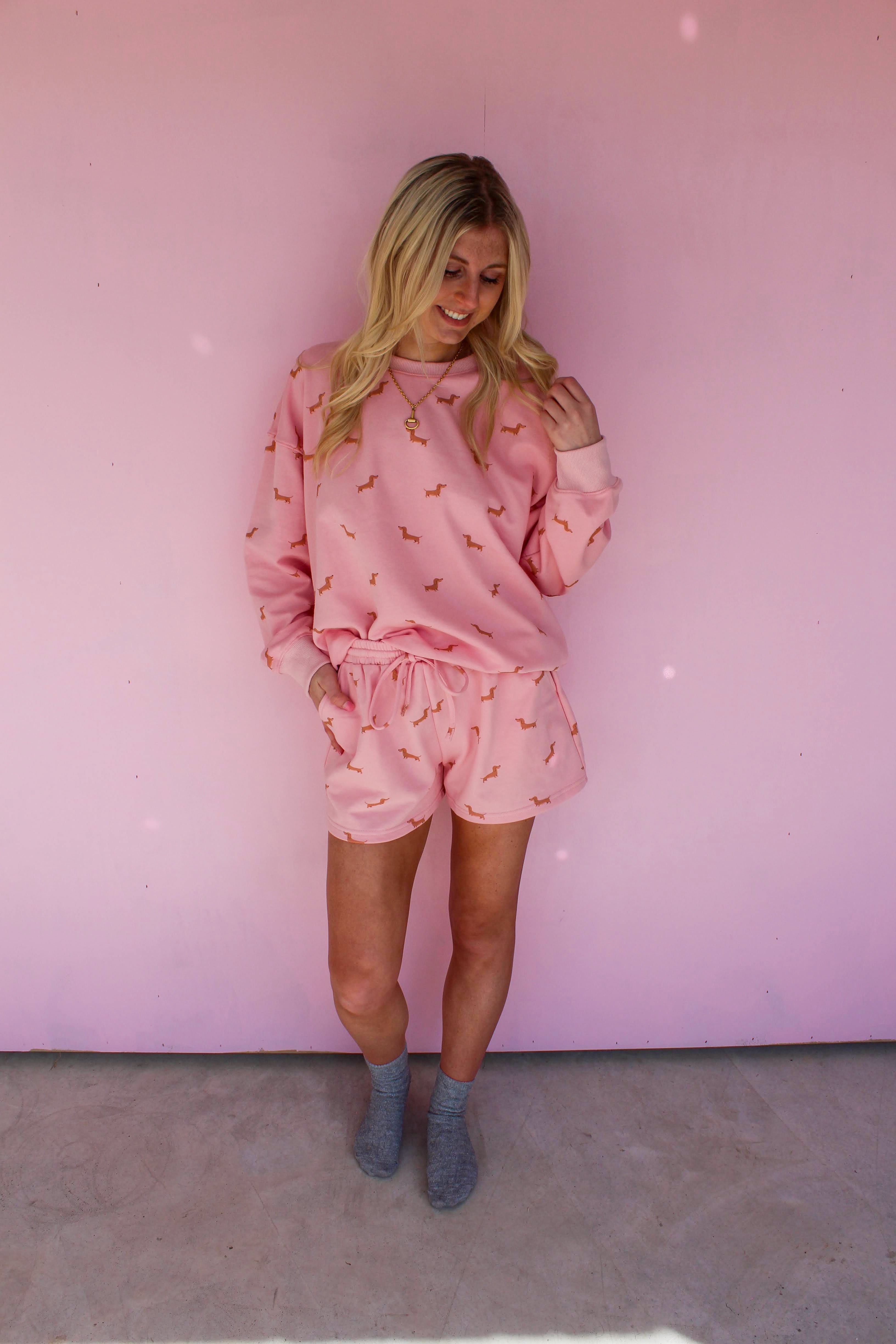 - pink pullover with elastic waist shorts